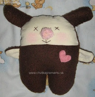 Toto malé stvorenie je zajko-mojko, ktorý už má aj svoju náhradnú „maminku“:-) Má asi 15 cm, s uškami trochu viac. Je z flísu a bavlnenej látky, výplňou je už tradične polyesterové rúno.