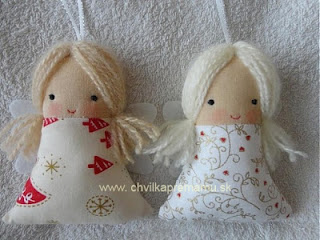 Výsledkom sú títo 13 centimetrov vysokí anjelikovia, ktorí sa zrodili z bavlnených látok, vlny, filcu a polyesterového rúna a množstva lásky:)